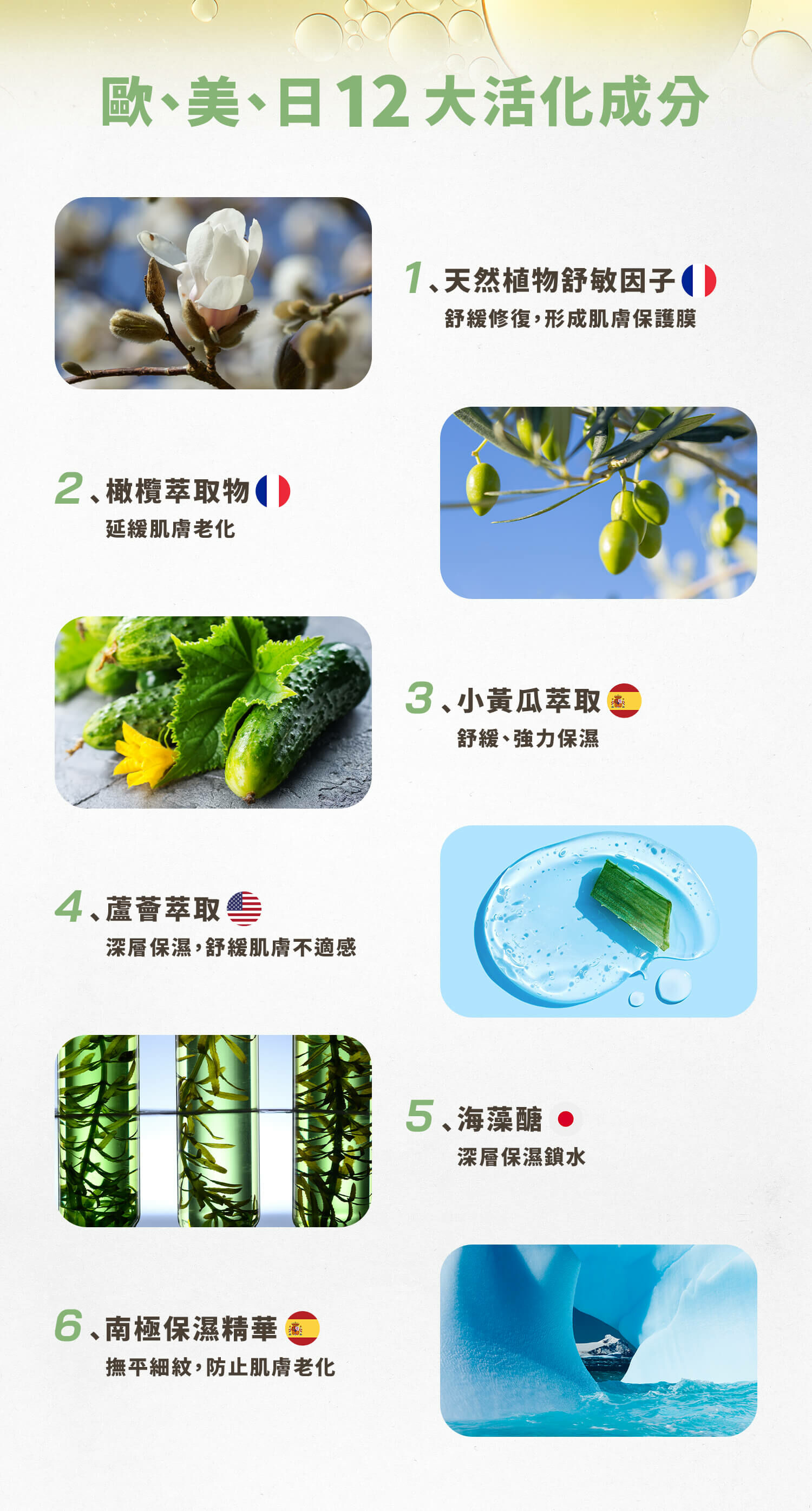 天然植物萃取舒敏修護複方成分,修復滋養肌膚,防止肌膚老化;內含蘆薈萃取成分,溫和舒緩曬後肌膚,不讓臉部不適隔過夜,使肌膚由內而外恢復光澤亮麗 !