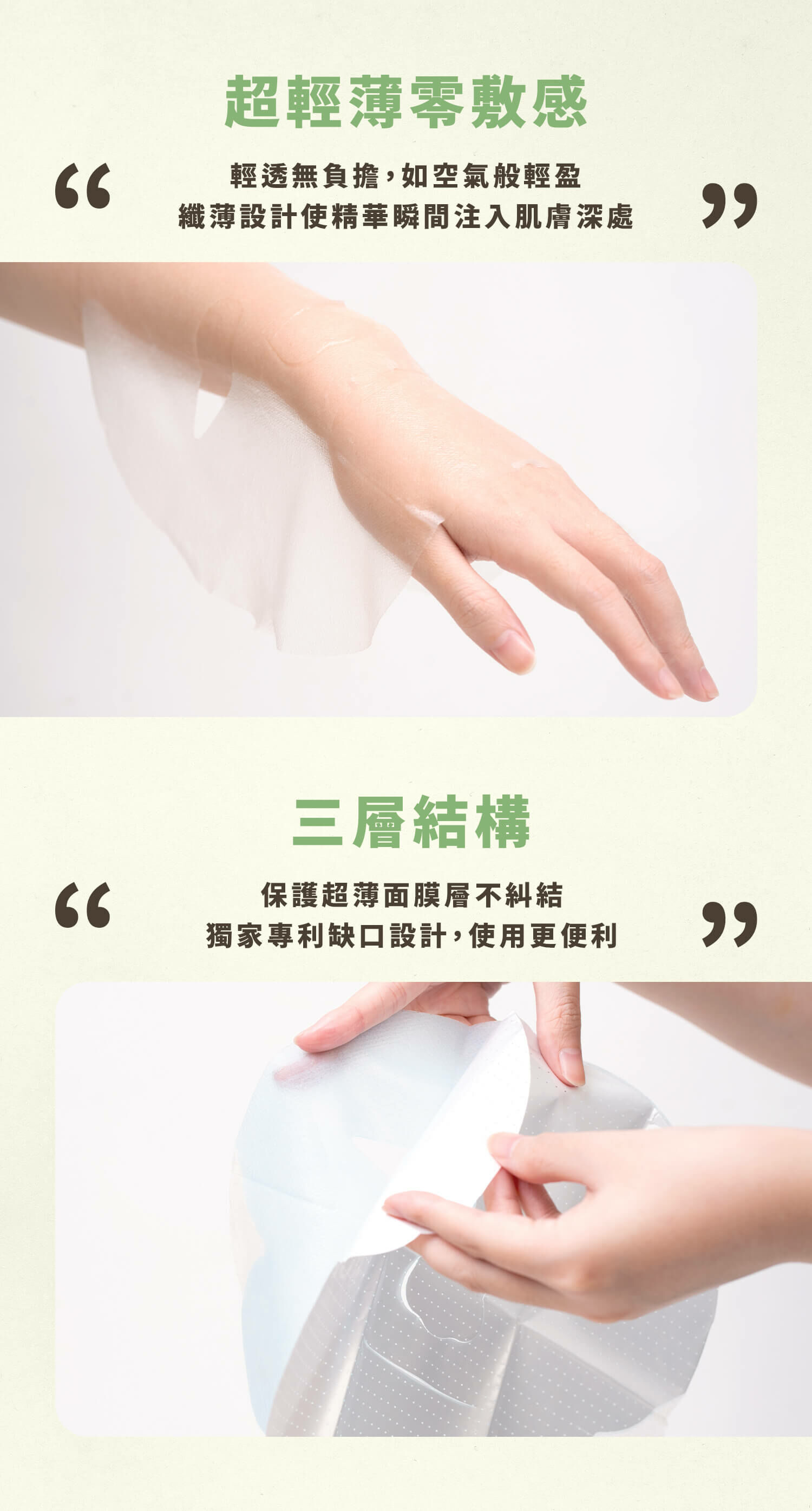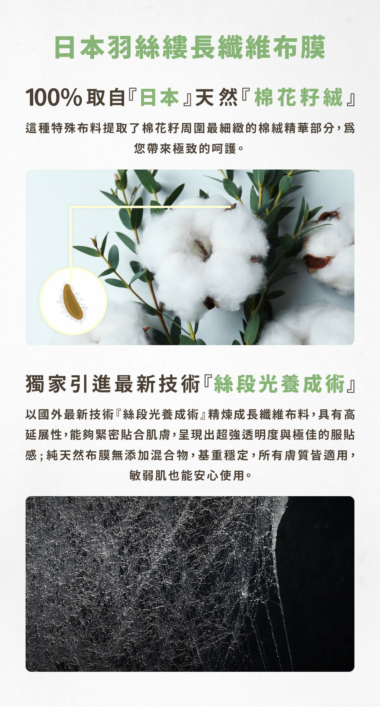 布膜採用專利日本羽絲縷,材質輕盈薄透,緊貼肌膚不滑落,讓您感受臻至的面膜享受。