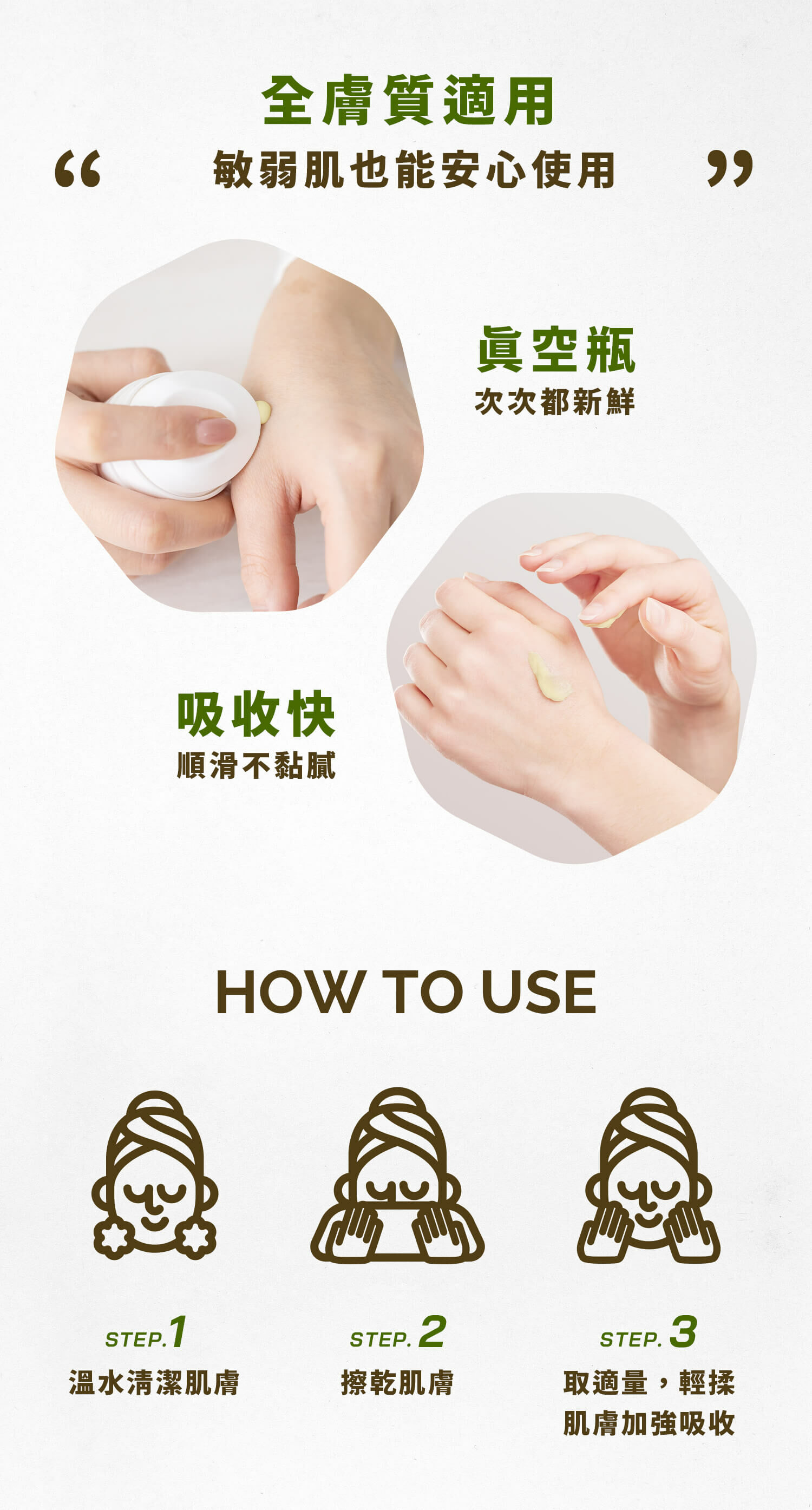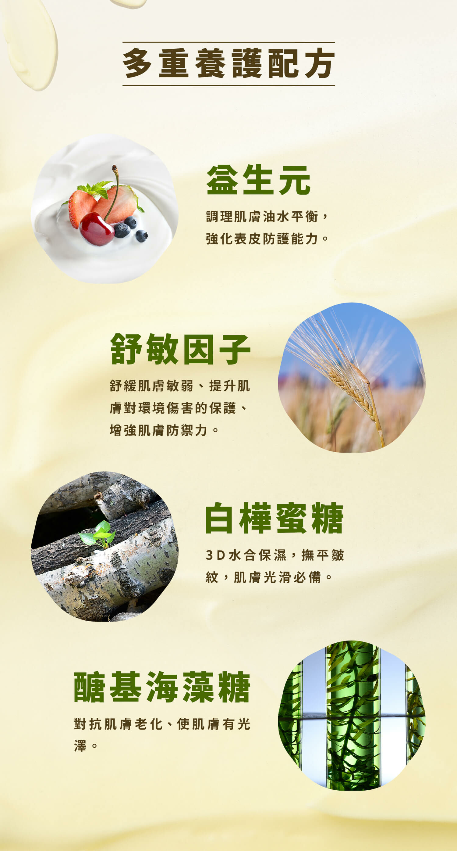 天然植物萃取舒敏修護複方成分,修復滋養肌膚,防止肌膚老化;內含蘆薈萃取成分,溫和舒緩曬後肌膚,不讓臉部不適隔過夜,使肌膚由內而外恢復光澤亮麗 !