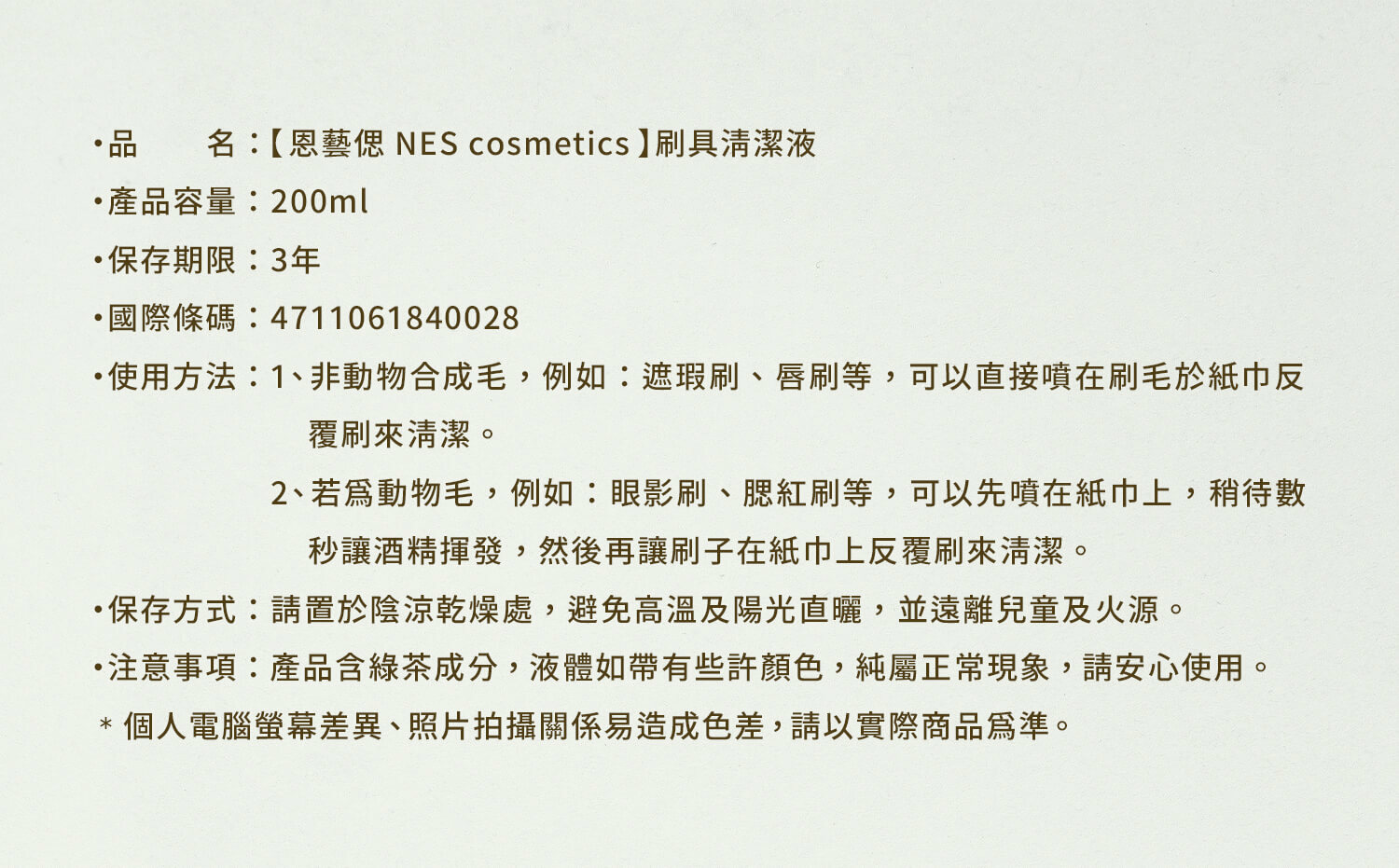 NES 溫和型刷具清潔液,具有快乾、除菌效果,使用後不需再次水洗,即可完成彩妝刷具的清潔。