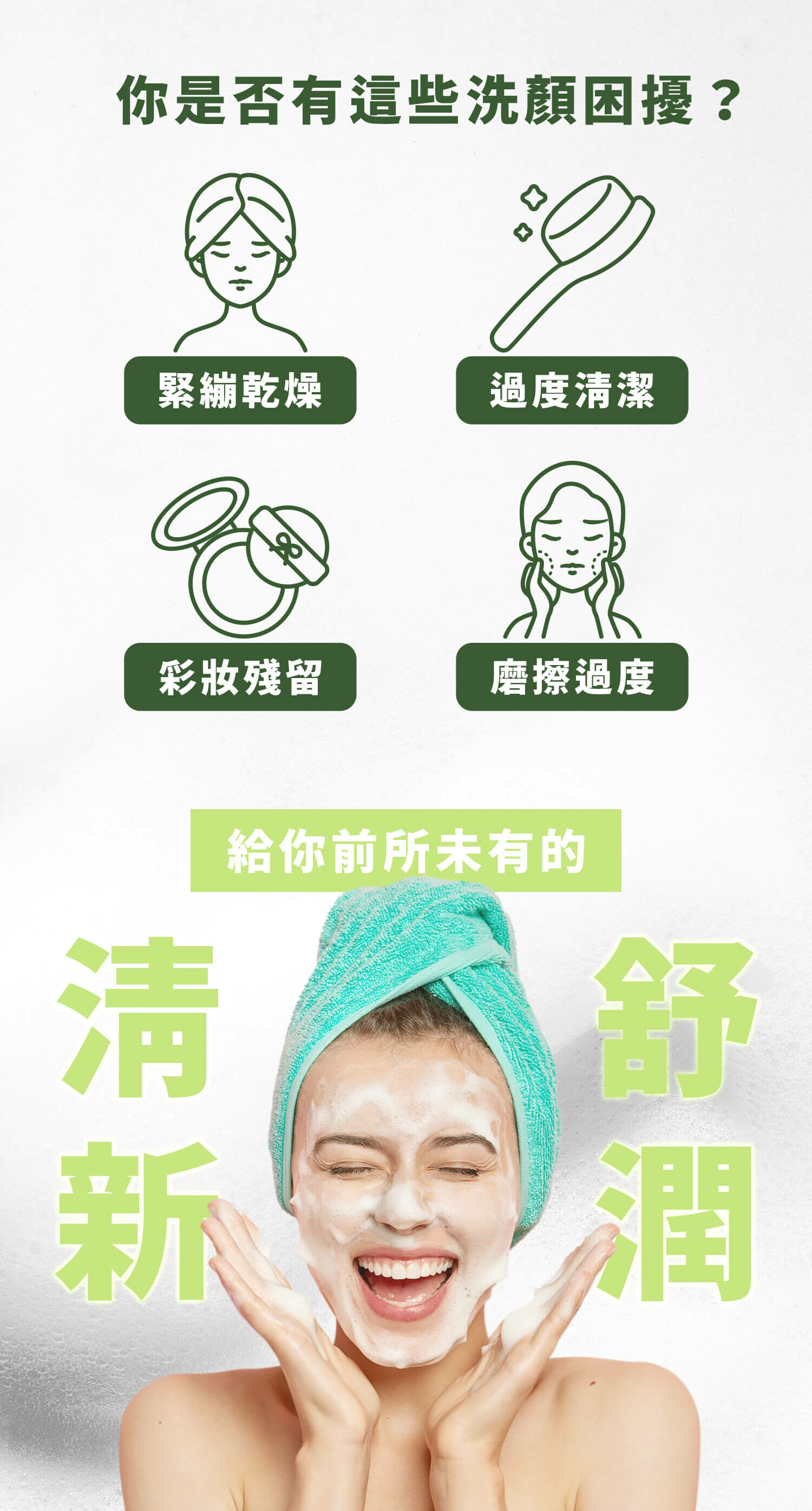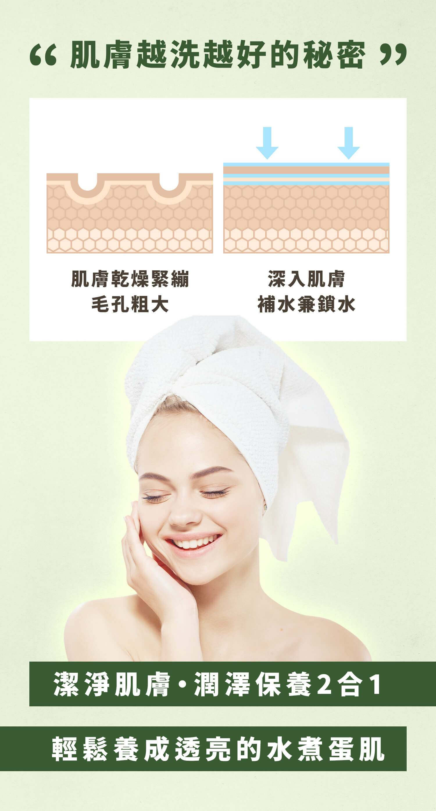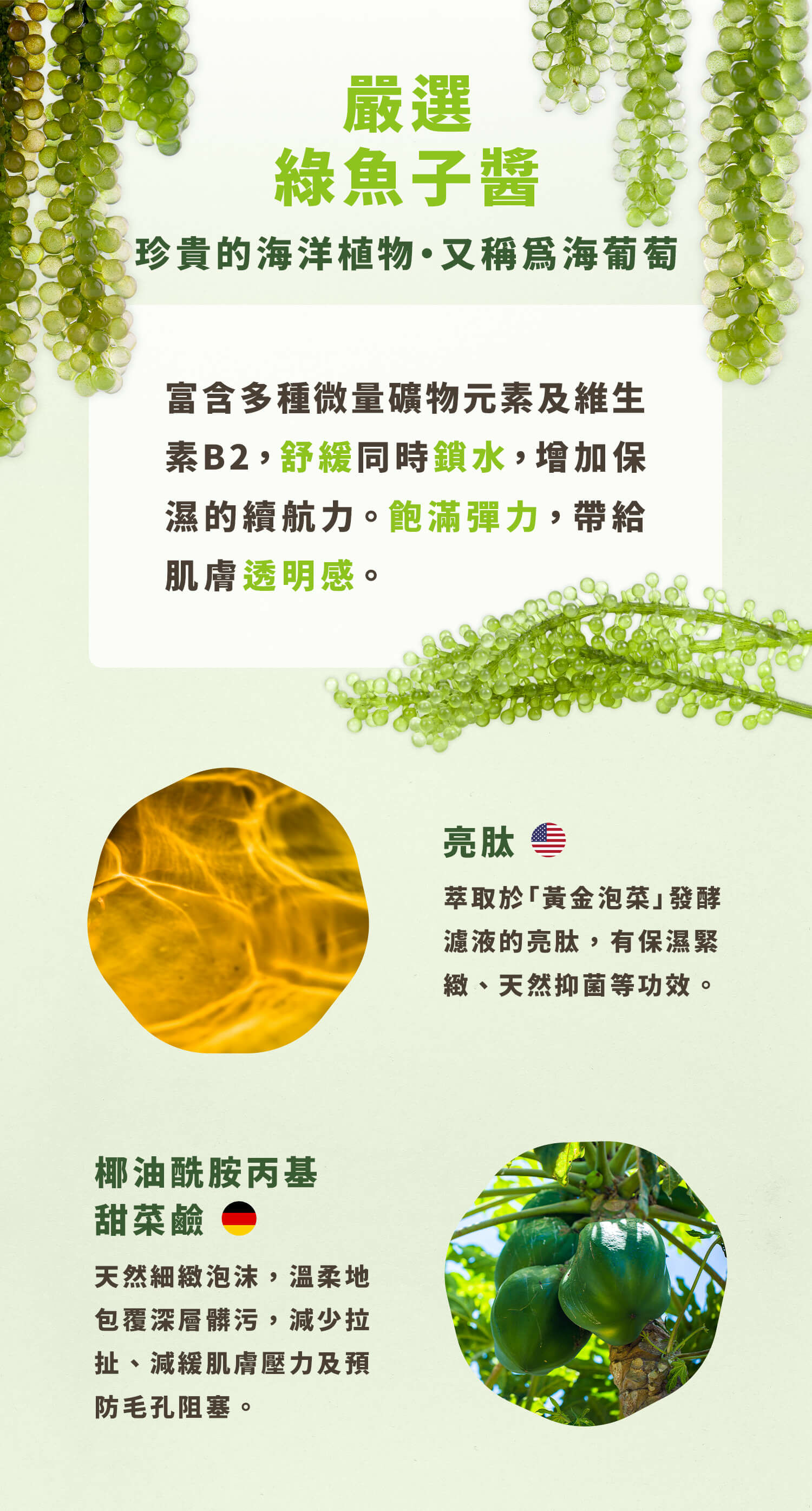 以源自於日本沖繩有綠色魚子醬之稱的海葡萄為主要基底成分,具有強大的保濕功能,能維持肌膚彈性,具長效保濕功能。美國原廠-亮肽,萃取於「黃金泡菜」發酵濾液的亮肽,有保濕、緊緻、天然抑菌等功效。搭配德國原廠「烷基醯胺甜菜鹼」溫和中性界面活性劑所產生細緻綿密的泡泡,能防止肌膚過度摩擦,減輕肌膚壓力,深入潔淨肌膚,清潔肌膚汙垢和油脂,預防毛孔阻塞及肌膚問題。洗完臉後,肌膚清爽無負擔,感受更徹底的潔淨洗顏感。